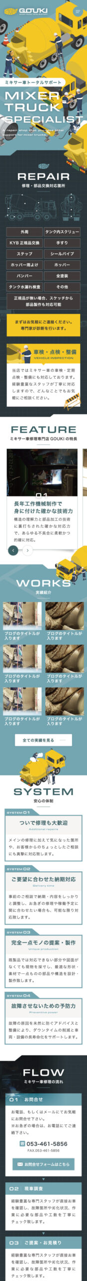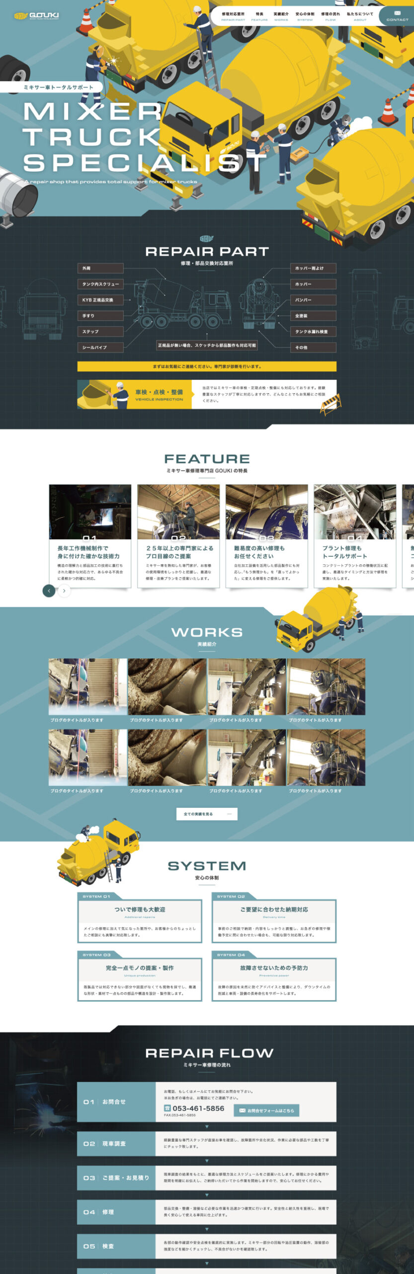 ミキサー車の修理・メンテナンスに特化した専門店としての高い技術と安心感を、イラストを中心に構築したデザインで表現しました。