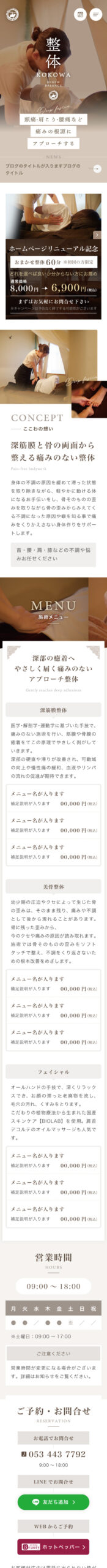 kokowaここわ様の整体が大切にしている価値を、サイト全体を通して自然に感じ取っていただけるデザインを目指しました。